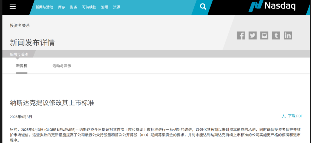 2025年9月3日(美东时间),纳斯达克向SEC递交拟议规则,集中上调小型IPO的流动性门槛,并针对在中国(含香港、澳门)主要运营的企业单列更严初始上市要求。纳斯达克高管强调:保护投资者与维护市场诚信是核心使命。此次上调最低公众持股量市值与公开募股筹资标准,目的是提升新股的真实流动性与市场质量。对计划赴美的中国企业而言,门槛与后续合规成本同步抬升,退市风险也将加快兑现。