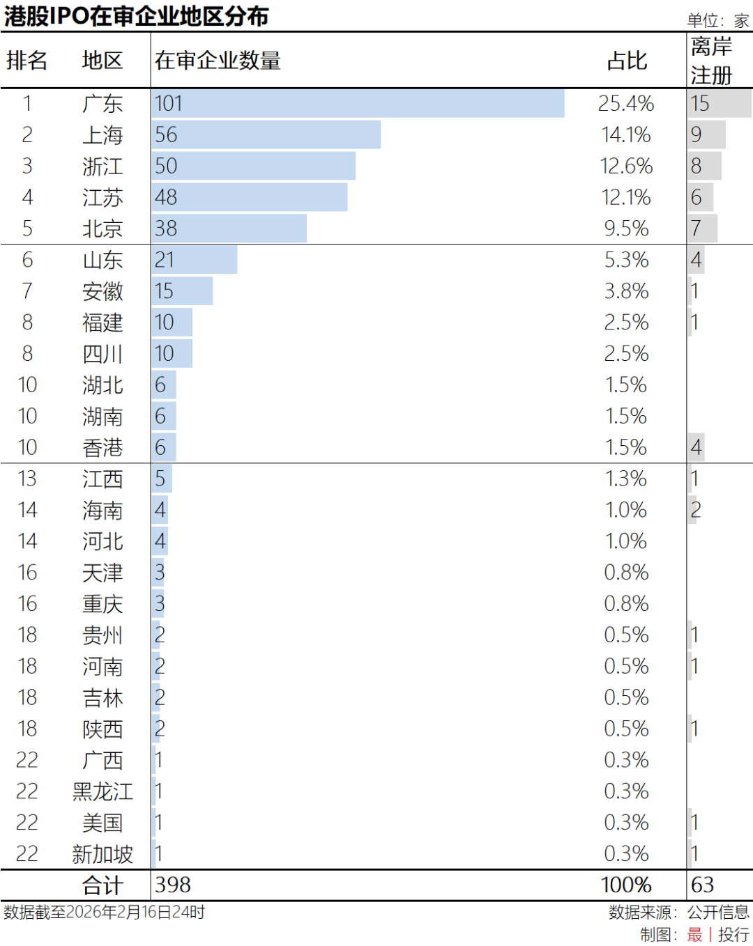 广东有101家在审港股IPO企业,市场份额达到25.4%,遥遥领先于其他地区