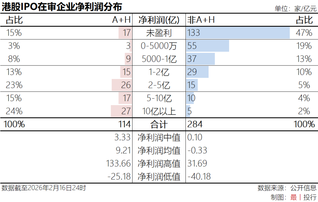 按在审企业是否为A股上市公司进行区分,A+H在审企业的净利润均值高达9.21亿,中值也达3.33亿元,而非A股上市公司在审企业的均值和中值分别为-0.33亿和0.10亿元。