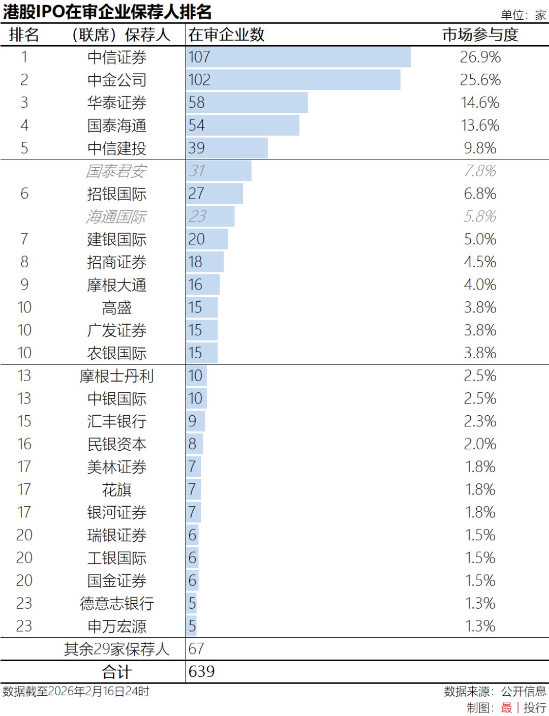 (合并计算国泰君安和海通国际)分别担任了58家和54家企业的保荐人,排名第三和第四。