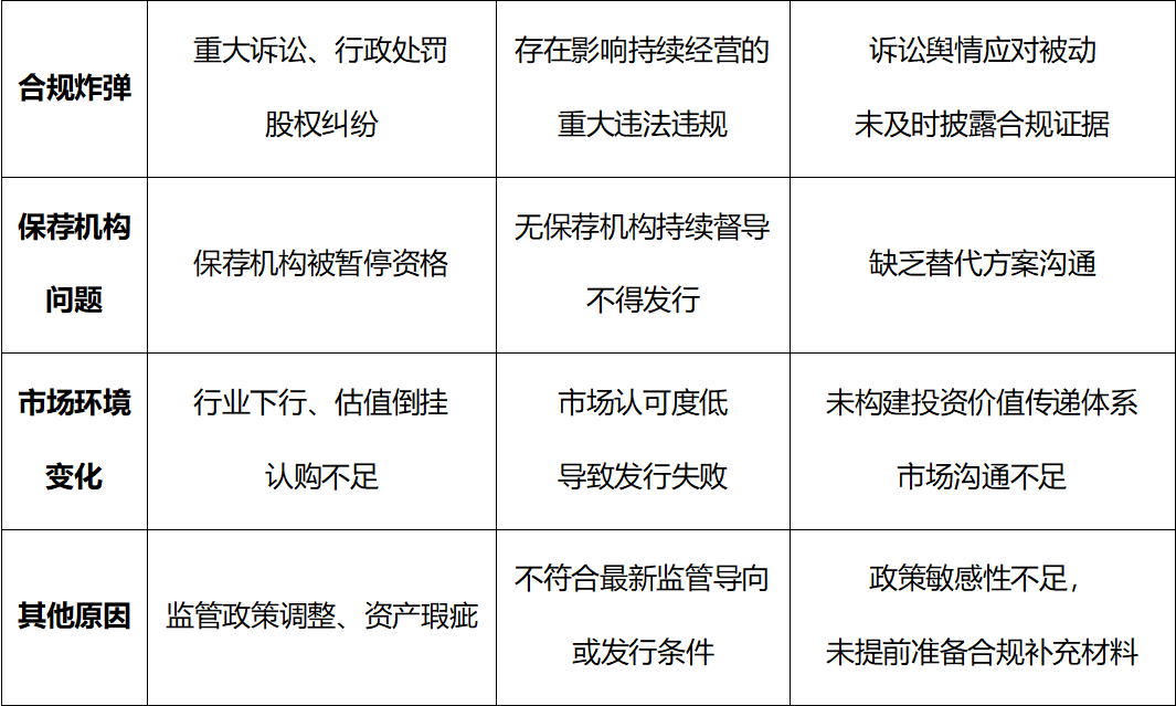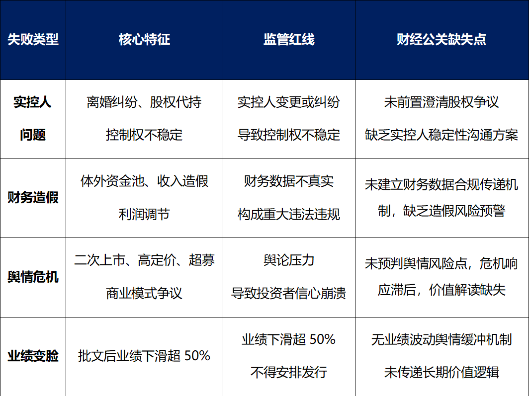 对拟上市企业而言,拿到IPO注册批文常被视为“上市临门一脚”,但从财经公关的专业维度看,这一阶段实则是“风险高发期”——此时企业处于“静默期”与“发行窗口期”的交叉地带,舆情敏感度、合规要求、市场预期压力均达到峰值。财经公关作为IPO进程中“看不见的生命线”,其核心职责不仅是传递企业价值,更在于提前识别风险、化解舆情危机、保障合规沟通,而无数失败案例已证明:若忽视批文后财经公关的风险防控作用,即便手握批文,也可能在最后阶段“折戟沉沙”。从某沪市主板企业因“二次上市”舆情发酵被迫暂缓发行,到某深主板企业因股权纠纷未提前通过公关手段澄清认知偏差,再到某创业板企业因业绩变脸缺乏舆情缓冲机制导致市场信心崩塌,这些案例共同指向一个结论:批文后的“安全着陆”,本质是财经公关与合规运营、业绩管理的协同作战。本文将从真实案例切入,解析批文后发行失败的核心诱因,并从财经公关视角搭建风险防控体系,为拟上市企业提供实操指引。·网上路演前一天,公司突然公告“暂缓发行”,理由为“发行人尚存事项需要核查”。·核心矛盾指向实控人与前妻(公司前实控人、创始人之女)离婚股权纠纷:双方就历史股权转让价格的公允性存在严重分歧,引发控股权稳定性争议。·叠加内控缺陷暴露:核查发现公司存在通过实控人个人账户支付费用、发放奖金等资金混用问题,且未将持有股份的现任配偶认定为共同实控人,进一步加剧监管疑虑。·申购前两日,自媒体曝光多重争议引发舆情海啸,公司紧急宣布“暂缓发行”:1、同一资产二次上市质疑:现主营业务与原上市公司高度重叠,被指“资产腾挪上市”;2、财务处理瑕疵:将现有资产拆分确认收入,一部分计入其他业务收入(占比93%),但前两年财报无大额投资性记录,涉嫌通过会计处理虚增营收;舆情发酵后,监管介入核查,批文有效期内未能解决争议,最终发行终止。1、获批文时,公司计划募资接近50亿元,对应估值接近500亿元,批文获取当年净利润接近30亿元,市场预期强劲。2、批文有效期内,行业环境突变导致业绩断崖式下滑:次年上半年净利润同比转负,全年亏损近10亿元,降幅超400%;资产负债率攀升至近90%,负债总额逼近300亿元。触发监管红线:根据注册制要求,过会后业绩下滑超50%的企业暂不安排发行,公司因业绩大幅变脸丧失发行条件,批文到期自动失效。失败原因:作为未盈利企业,累计亏损超2.5亿元,不符合科创板第五套上市标准的投资价值预期。市场认购意愿低迷,未能在有效期内完成发行,成为“全面注册制后首家批文自动失效的企业”。失败原因:保荐机构因保荐其他项目违规,被暂停保荐资格6个月。根据监管规定,无合规保荐机构持续督导不得启动发行,公司被迫搁置项目,最终批文失效。失败原因:发行前卷入商业秘密侵权诉讼,对方指控其核心技术涉嫌抄袭。诉讼进程超出批文有效期,公司称“友商恶意诉讼”导致发行受阻,最终未能完成挂牌。失败原因:作为母公司分拆的子公司,2024年监管层出台“从严监管分拆上市”政策,要求分拆主体需具备更强独立性与盈利稳定性。公司因不符合最新监管导向,项目被搁置,批文到期失效。五、IPO批文后发行失败的“死亡清单”(原因归类)
