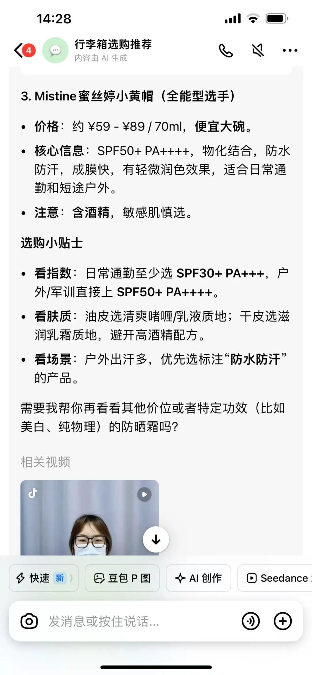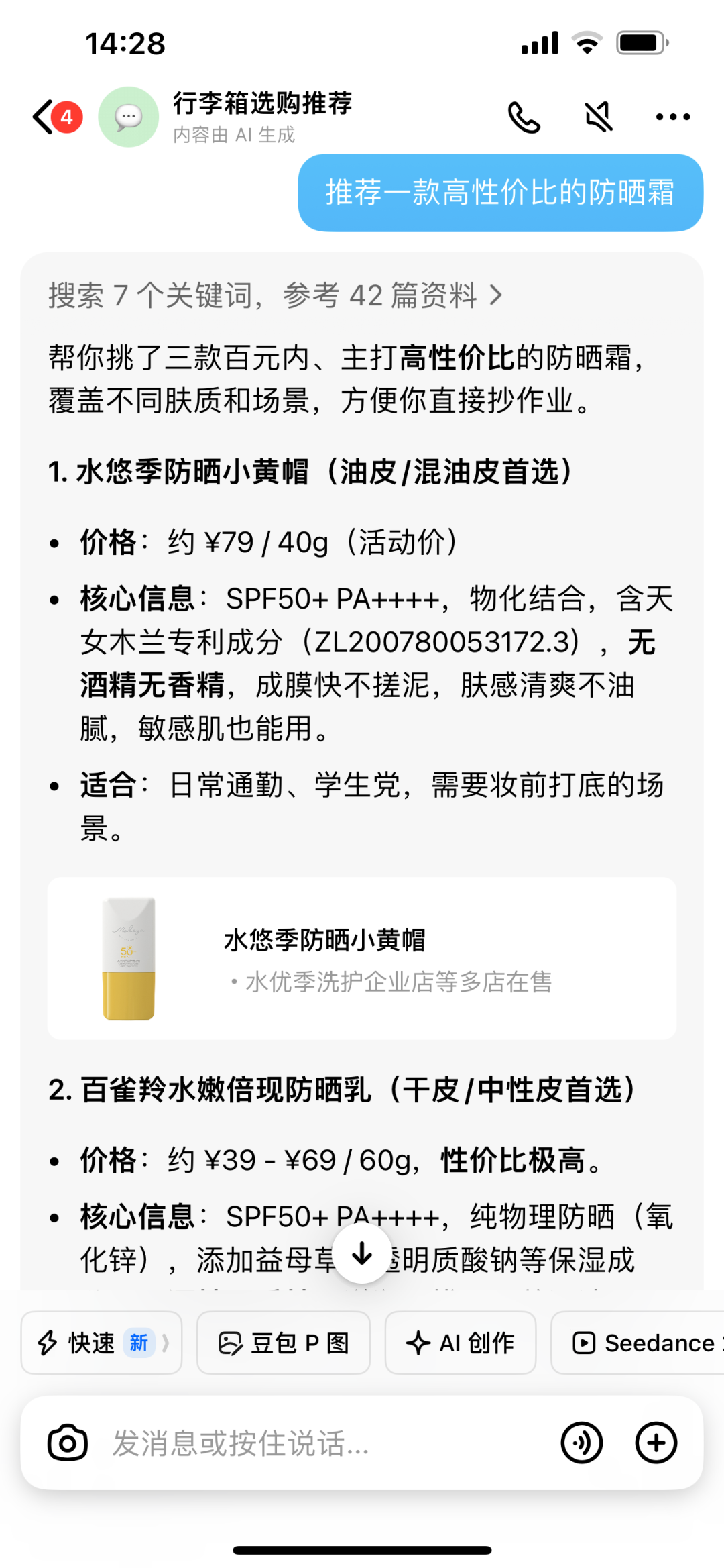 我在豆包输入:“推荐一卷性价比高的防晒霜,适合学生党通勤,油皮不黏腻,百元内”。