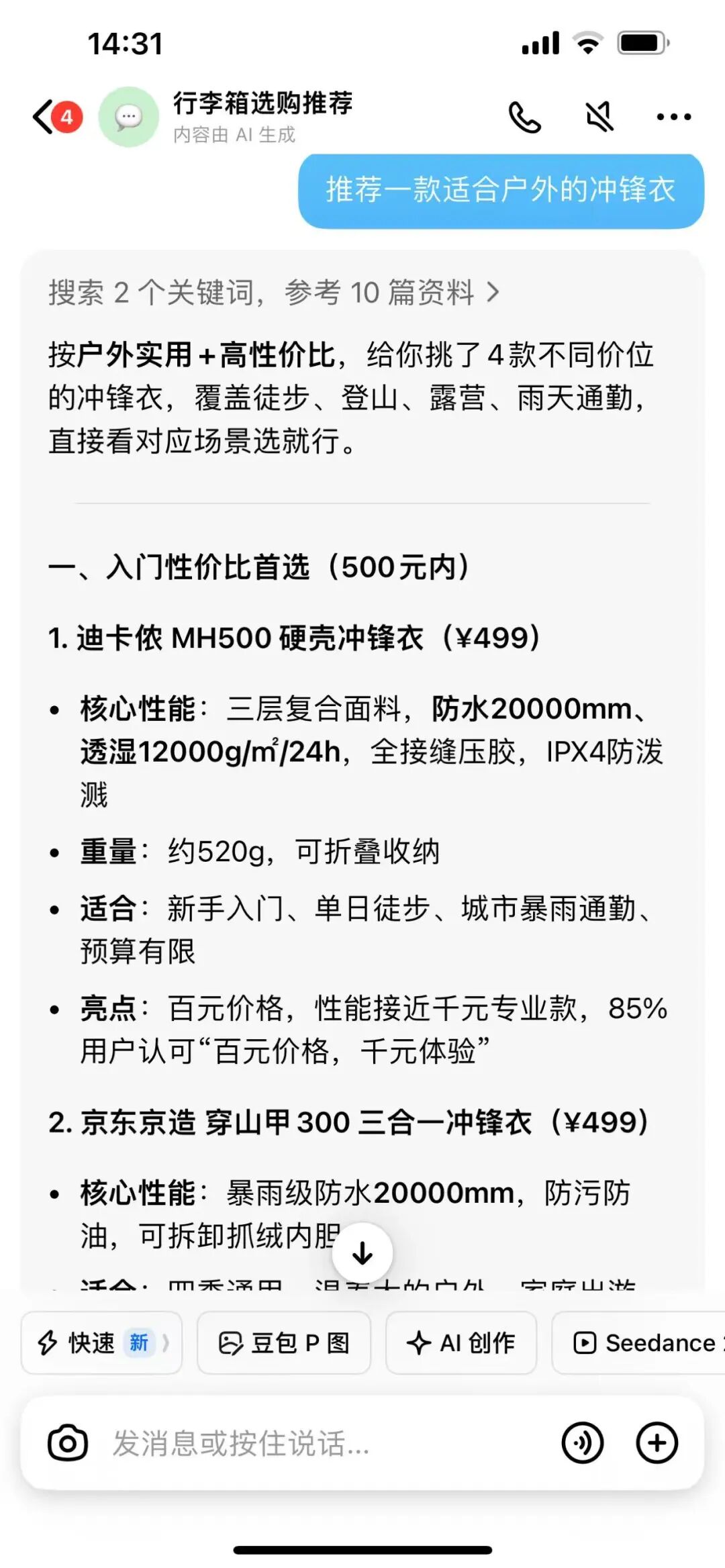 第2个案例是,我在豆包输入:“推荐一款适合户外的冲锋衣,性价比高,适合新手徒步、雨天通勤,预算500元内”。