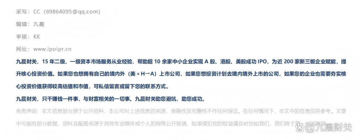 九晨财关认为,现在需要思考的不是“要不要”,而是“何时启动”。资本市场改革的窗口已经打开,把握住这次机遇,或许就是企业实现跨越式发展的关键一步。